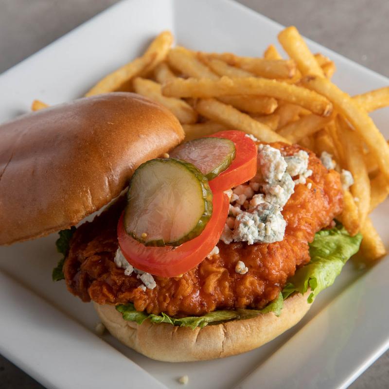 Fried or grilled buffalo tossed chicken, lettuce, tomato, house-made pickles, bleu cheese crumbles on brioche bun