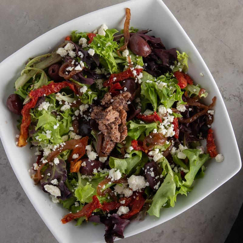 Sun-dried tomato, feta cheese, balsamic onions, kalamata olives, candied pecans, mixed greens