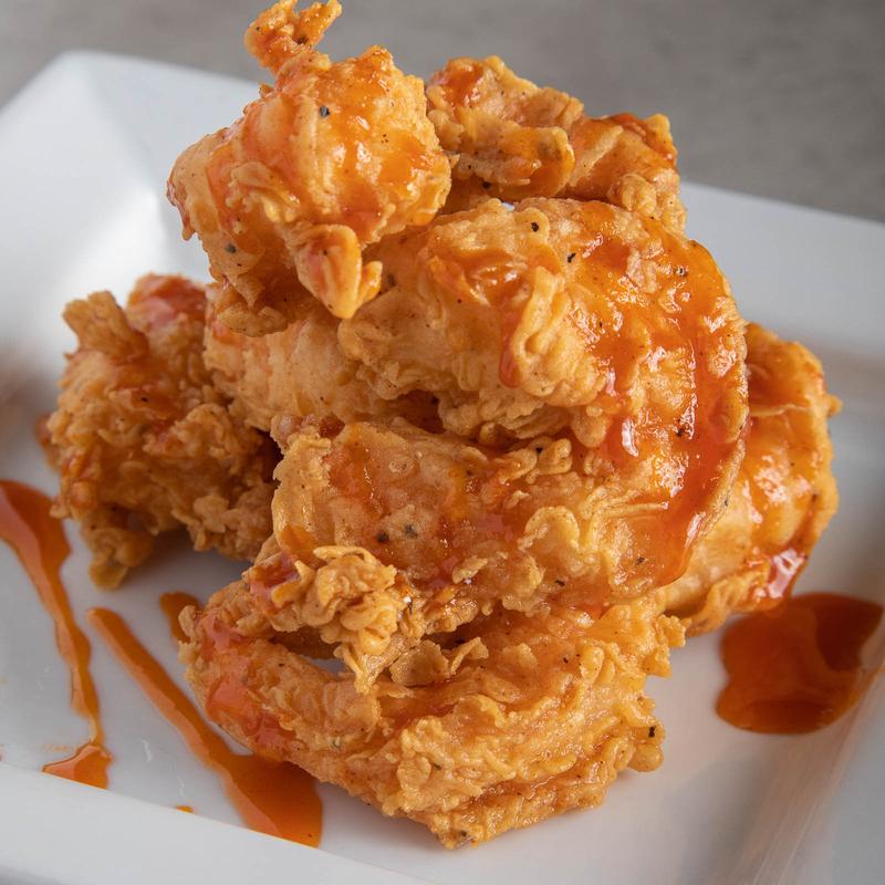 Fried jumbo shrimp, sweet & spicy tabasco drizzle