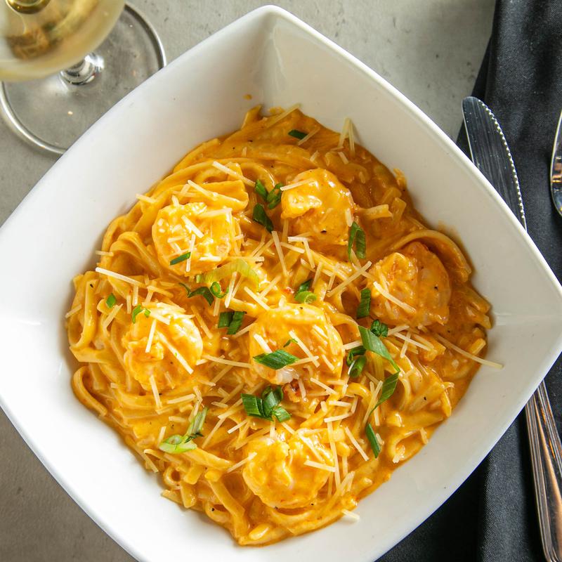 Sauteed shrimp and linguine tossed in a roasted red pepper, brie cream sauce